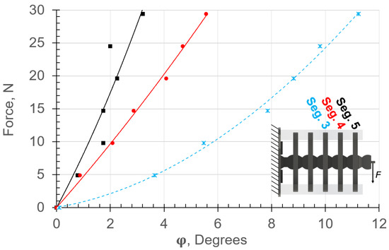 The experimental and analytical range of motion, , due to the application of forces in the vertical and horizontal directions are provided in Figure 14 and Figure 15, respectively. The experimental and analytical results are shown in markers and lines, respectively. The angle and force F are expressed in degrees and N, respectively. The displacements were calculated using (9), where the force–displacement relationships included the material nonlinearity.