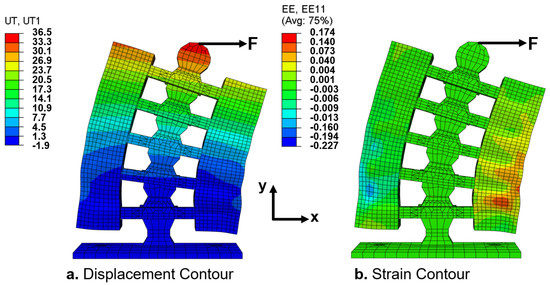 The contours of the transverse displacement in the X-direction and principle strain, , are reported in Figure 16 for the 29.4 N force (Figure 15). The maximum deflections obtained from the simulations were in good agreement with the experimental results. The largest error was ∼4.4% at 29.4 N, where the FEA and experimental deflections were 11.0° and 11.5°, respectively (Figure 16). The deviation between the simulations and experiments could be attributed to the low geometric tolerances of 3D printing and silicone casting. Figure 16 shows that the tension and compression in the hyperelastic material were maximum and minimum between the lower and top ribs, respectively. For example, the strains in the stretched and compressed regions of the spring were approximately 17.4% and 22.7%, respectively. On the side, the elastic stretch caused distributed strain in the nonlinear material from 2% to a maximum 22.7%, where substantial elastic necking occurred. Conversely, the strain in the compressive side was more distributive than that in the stretched side. This is common behavior in hyperelastic materials [48]. However, including compressive tests of the hyperelastic material may remedy the deviation between the FEA and experimental results.