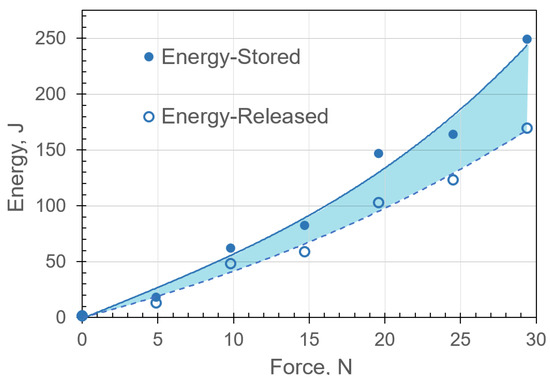 Estimating elastic energy storage was achieved by calculating the forces required to restore the assembly to its equilibrium state, i.e., to the assembly’s centerline. The total elastic energies stored and released were obtained using Equations (10) and (11) and included the contribution of the linear and nonlinear stiffness. The total stored energy from the experimental and analytical results as a function of the applied force were in good agreement, as shown in Figure 17. It can be observed that the stored elastic energy increased considerably in the nonlinear region as the applied force was increased. Hence, increasing the force increased the stretch–contraction in the hyperelastic material, and energy aggregation increased nonlinearly. Energy efficiency was approximately 68% for the maximum displacement of the entire system in the vertical bending configuration. Efficiency was calculated as the ratio of the energy released and injected. The energy dissipation can be attributed to the hyperelastic material’s damping. Detailed discussion is provided in Section 6.2.