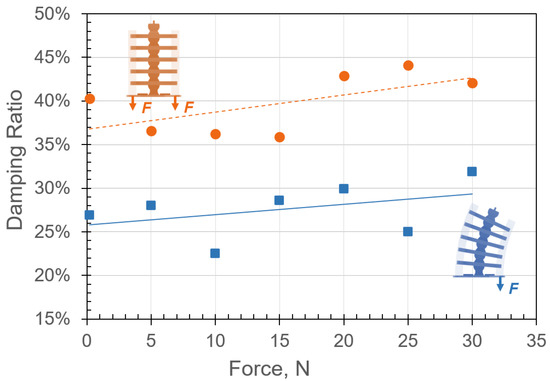 The corresponding damping due to applied forces in single-sided and double-sided tension configurations are reported in Figure 19. Both configurations show that an increase in the internal forces increased the overall structural damping. As expected, the system was highly damped due to energy absorption by the hyperelastic materials [6] and frictional forces between the joints [28]. For an applied internal force of 29.4 N in the single- and double-sided tension configurations, the damping ratios were approximately 32% and 42%, respectively. It is important to point out that the stiffness appeared to plateau asymptotically as the applied force was increased. While damping in Figure 19 appears to increase linearly, it should plateau as we increase the load, since it cannot continue this trend forever. The linear appearance could be due to the scatter in the data, which is common when estimating the damping of vibratory systems [37]. This behavior is also consistent with the soft material stress–strain response (Figure 12).