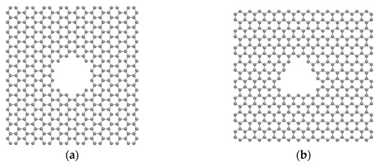 The model of the multilayered nanoporous graphene system used in this study is shown in Figure 1. The multilayer was formed by tightly stacking five graphene sheets with a layer spacing of 3.5 Angstroms. Two reservoirs with TIP3P-EW [32] water molecules were used, one on each side of the graphene sheets. The size of the simulation system was 30 Å × 30 Å × 140 Å. The configuration of the simulation domain is given in Figure 1. Two different-shaped pores were used in this study. The first pore type is closer to a circular geometry, hence it is considered a circular pore, and the other pore that closely resembles a triangle is termed a non-circular (NC) pore in this study. The circular pore geometry had an effective diameter of 10 Å. The effective diameter refers to the circle with the maximum diameter that can be inscribed inside the pore. The non-circular pore used in this study had the pore size in which an effective equilateral triangle with a length of 10.40 Å can be inscribed inside the pore. The graphene layers with pores were modeled using SAMSON (Software for Adaptive Modeling and Simulation of Nanosystems, SAMSON version 2022 R1) software [33] and the structure was energy minimized using the FIRE (Fast Inertial Relaxation Engine) algorithm [34]. The molecular dynamics simulation was carried out using LAMMPS software (Lammps version 3 March 2020) [35]. The visualization of the simulations was carried out using used VMD (visual molecular dynamics) software (VMD version 1.9.4a55) [36]. A pressure difference of 150 MPa was applied to simulate the water transport. The pressure difference was achieved by applying ambient pressure to the graphene layer (which acts as a piston) present at the end of the permeate region and the desired pressure was applied to the graphene piston at the end of the feed region [31]. The simulation consisted of 2138 water molecules in total, of which 1710 water molecules were present in the feed region and 428 water molecules were present in the permeate region at the beginning of the equilibration run. Lennard–Jones potential was used to represent the interactions between atoms and the SHAKE algorithm [37] was used to keep the water molecules constrained. The canonical ensemble NVT and Nosé-Hoover thermostat [38] were used in this study. PPPM style (particle–particle particle–mesh) was used to treat the long-range electrostatic interactions between the atoms. The setup was equilibrated for 1 nanosecond and the production run was carried out for 7 nanoseconds with a timestep of 1 femtosecond. The cut-off distance for the truncation of the potential interactions used in this study was 10 Å. We used AIREBO (adaptive intermolecular reactive bond order) potential [39] for the interactions between the carbon atoms for the multilayered membrane. The interactions between the water molecules and the graphene were calculated using the Lorentz–Berthelot mixing rule.