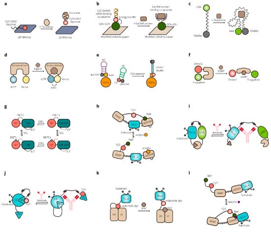FRET- and BRET-based biosensors are widely used for basic research on biological processes, such as signaling pathways, metabolism, and cell behavior, and to detect various substances of interest in organisms, both qualitatively and quantitatively. Biomarkers in the body, such as small molecules, nucleic acids, enzymes, proteins, antigens, hormones, metabolites, organelles, and cells, can be related to diseases and provide the possibility for precise and early diagnosis. Exosomes have been reported as valuable biomarkers associated with cancer-linked public health issues. For the quantitative detection of exosomes, Zhang et al. developed a self-standard ratiometric FRET nanoprobe, a Cy3-labeled CD63 aptamer (Cy3-CD63 aptamer)/Ti3C2 MXenes nanocomplex []. Without exosomes, the Cy3-CD63 aptamer could bind onto the Ti3C2 MXene nanosheets and FRET between the Cy3 and MXenes could cause the quench of the fluorescence signal from Cy3-CD63 aptamer. With added exosomes specifically combined with the aptamer and released from the surface of Ti3C2 MXenes, the fluorescence signal of Cy3 recovered. The hardly changed self-fluorescence signal of MXenes acted as a standard reference []. Krull et al. developed a FRET-based system for the sensitive screening of protein-based cancer biomarkers []. The aptamer-linked quantum dots (QDs-Apt) that could bind to the cancer biomarker protein epithelial cell adhesion molecule (EpCAM) was the donor and Cy3-labeled complementary DNA (cDNA) was the acceptor. With EpCAM competitive binding to QDs-Apt, the cDNA was displaced, resulting in the reduction of FRET [].
