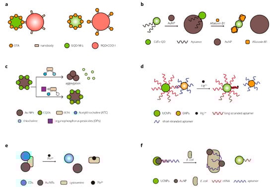 FRET- and BRET-based biosensors are used in the detection of toxic small molecules in food and the environment. Tang et al. designed a nanobody-mediated immunosensor based on FRET between different-sized QDs []. QDs of two sizes were covalently labeled with OTA and Nb, acting as the energy donor and acceptor. Both the free OTA and the donor could bind to the acceptor. When OTA concentration increased, the FRET efficiency decreased for less donor bonded to the acceptor. The sensor allowed rapid detection of OTA in agto-products in 5 min with a detection limit of 5 pg/mL []. Sabet et al. developed a FRET-based sensor for the detection of aflatoxin B1 (AFB1) []. The QDs conjugated with aptamer in the sensor were quenched via FRET without AFB1 due to the interaction of the aptamers with AuNPs. The aptamers were attracted to the added AFB1 from the AuNPs, and the fluorescence could recover. The developed biosensor was applied for the analysis of AFB1 in rice and peanut samples []. A series of biosensors based on FRET for the determination of organophosphate pesticides were designed by Wu et al. []. The fluorescence emission of carbon quantum dots (CQDs) could be quenched by AuNPs. Butyrylcholinesterase (BChE) could hydrolyze acetylthiocholine (ATC) to produce thiocholine, which could cause the aggregation of AuNPs and the corresponding recovery of FRET-quenched fluorescence emission. With the organophosphorus pesticides (OPs), the recovery of fluorescence in the sensor was reduced owing to the irreversibly inhibited catalytic activity of the BChE by the OPs. The biosensor was applied for OP detection in tap and river water samples [].