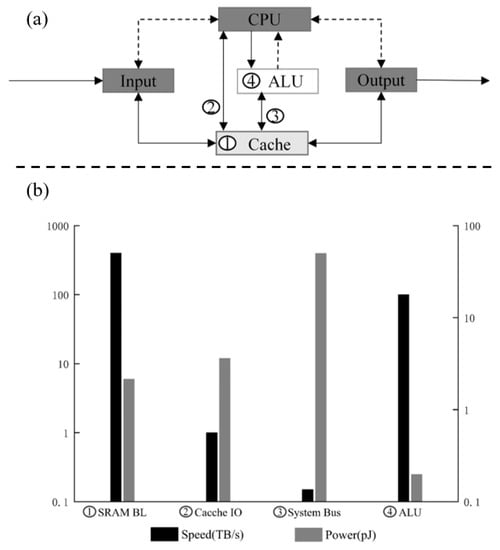 In recent years, the rapid development of data centers, AI, 5G, and HPC has increased the demand for computer computing power. However, the traditional von Neumann architecture makes the computing chip separate from the memory separated physically. When accessing memory to process data, it often takes a great deal of time as well as energy, which can lead to the so-called “storage wall” problem []. For example, as shown in Figure 1 [], the CPU rate is 92 TB/s, while the cache rate and bus bandwidth are 1 TB/s and167 GB/s. The data transfer between CPU and off-chip memory consumes two orders of magnitude more energy than floating-point operations [], which severely limits the overall chip performance. At the same time, with the slowdown of Moore’s Law, to meet the requirement of doubling the computing power every two years, it is necessary to add additional chip size, which increases the manufacturing cost and also reduces the chip yield. Therefore, it is becoming less and less cost-effective to improve chip performance and reduce power consumption by upgrading the IC process []. To efficiently process such large amounts of data and break up the “storage wall”, it is necessary to develop PIM technology [,]. The core of this architecture is to embed computational power in memory to reduce the high latency and power consumption generated by data movement and to solve the “storage wall” problem []. In recent decades, some PIM architectures have been proposed, and their performance has been improved by tens, hundreds, or even thousands of times compared to the traditional von Neumann architecture [,,,].