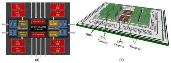 (a) “Rome” CPU architecture (reprinted from Ref. [], Copyright 2021, with permission from IEEE); (b) Chiplet-based accelerated processing units (reprinted from Ref. [], Copyright 2017, with permission from IEEE).