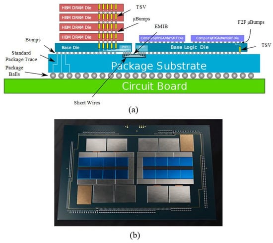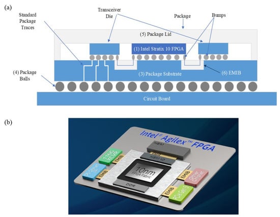 (a) The physical construction of the EMIB package (reprinted from Ref. [], Copyright 2019, with permission from IEEE); (b) Intel Agilex FPGA structure layout (reprinted from Ref. [], Copyright 2020, with permission from IEEE).