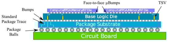 Intel’s Lakefield processor combines heterogeneous 3D chip stacking with hybrid computing through Foveros []. As shown in Figure 7, the Chiplets are stacked face-to-face on an active silicon adapter board. The performance of Lakefield is 24% more energy-efficient than Core i7-8500Y, while there is up to 91% improvement in power consumption in the former [,]. In this architecture, the μBumps used have a pitch of 50 μm and a diameter of 20 μm, which can provide shorter interconnect distances []. The ultra-short interconnect length reduces heat generation and parasitic capacitance/impedance, which helps reduce power consumption to achieve high-speed connections with high bandwidth. Lakefield achieves high performance, low power, and small form factor by combining hybrid computing and 3D chip stacking and scaling PC clients to mobile size for low standby power in mobile devices.