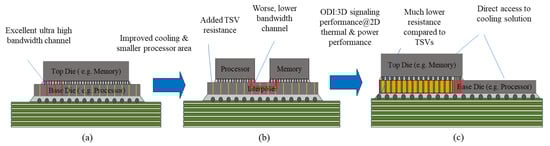 Combining the advantages of packages such as EMIB and Si adapter boards, Intel continues to introduce omni-directional interconnect technology (ODI) []. It provides greater flexibility for all-around interconnect communication between small- and medium-sized chips in a package and is still in the development stage. The ODI packages offer three types of direct interconnects: (1) chip-to-chip direct interconnects for high bandwidth, high scalability, and short channel distances; (2) top-level chip-to-package substrate direct interconnects for direct power supply and reduced chip I/O parasitic effects; (3) bottom-level chip-to-package substrate direct interconnects. Conventional 3D stacking uses TSVs to achieve high bandwidth communication between the top and bottom chips but is limited by the increased TSV area and heat, as shown in Figure 9a. The passive Si-adapter-based 2.5D technology allows for better thermal management of the processor and memory, but it also reduces communication bandwidth and increases power, as shown in Figure 9b. By optimizing using the ODI as shown in Figure 9c, it is possible to maintain good thermal performance and minimum TSV area for 2.5D while still obtaining the same bandwidth benefits as 3D stacking.