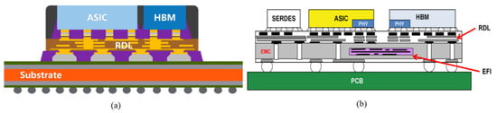The 2.5D/3D Chiplet architecture based on silicon adapter boards provides enough fine pitch to accommodate high-speed connections with high bandwidth. However, the thickness of the wires on the adapter board is not ideal to support large switching currents. Fan-out packaging technology utilizes high-density redistributed layers (RDL) for integration between Chiplets, enabling flexible and efficient computing systems. As shown in Figure 10a, fan-out chip on substrate (FOCoS) technology with ultra-high I/O density is also capable of memory and computation integration []. FOCoS is a fan-out package flip chip mounted on a high-pin-count BGA substrate with a fan-out package RDL. It allows shorter D2D interconnects to be built between multiple chips, which can be used to package application-specific integrated circuits (ASICs) and HBMs. In 2018, Chong et al. introduced a high-density interconnect between ASICs and HBMs using embedded fine-pitch interconnect chips (EFIs) in a redistribution layer-first fan-out wafer-level (FOLWLP) packaging platform, as shown in Figure 10b []. EFI can provide multi-layer high-density interconnects from 2 μm to 0.4 μm copper to meet the 2Gbps data transfer rate between ASIC and HBM.