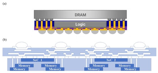 In addition, fan-out packaging technology can also be considered a substrate-free vertical stacking packaging method. There is a lower cost of fan-out package implementation compared to silicon-adapter-board-based 3D packages. The package structure of the Apple A10 processor is shown in Figure 11a, which uses integrated fan-out (InFO) technology to integrate the application processor and DRAM in the same package [,]. InFO provides a vertical signal path from the top LPDDR package to the SoC in the InFO package via TIV (through-InFO-via). In addition, InFO features multiple layers of high-density 2/2 μm RDL line widths/spacing, allowing the integration of multiple advanced nodes of Chiplets to reduce costs and improve performance. The A10 processor is 120 times more powerful than the first-generation iPhone chip and 40% more powerful than the A9 processor in the iPhone 6s. Because RDL replaces the substrate in flip-chip packages, InFO offers the advantages of wafer-level integration, such as low latency communication between chips, high bandwidth density, and low PDN impedance. In 2019, Jhih et al. developed 3D-MiM (MUST-in-MUST) integration technology on top of InFO-based and used it to integrate 8 SoCs with 32 memory chips []. It was used to simulate the system integration of multiple logic chips with multiple memory chips in HPC applications, as shown in Figure 11b. The modular storage unit in this architecture integrates multiple vertically stacked memory chips via InFO. Memory modules can be embedded directly at design time, greatly reducing design complexity and shortening time-to-market. In addition, unlike 2.5D packages, InFO’s integrated memory modules allow for flexibility not only horizontally but also vertically for improved scalability.