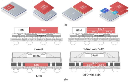 (a) Principle of SoIC Technology (reprinted from Ref. [], Copyright 2019, with permission from IEEE); (b) compatible use of SoIC with CoWS and InFO (reprinted from Ref. [], Copyright 2021, with permission from IEEE).
