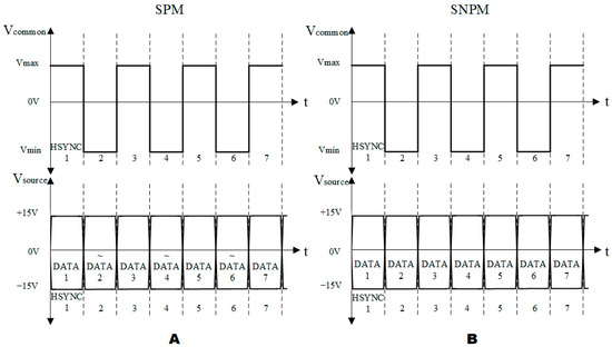 Waveform diagram of AC driving model. (A) Diagram of the source polarization model (SPM). (B) Diagram of the source non-polarized model (SNPM).