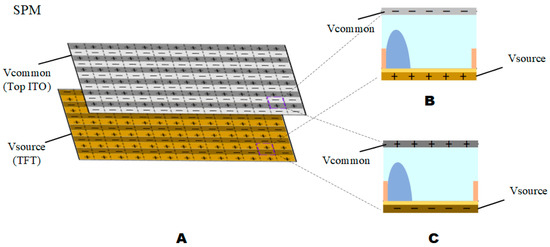 As shown in Figure 14, compared with the aperture ratio when in SPM, the aperture ratio in each AC case when in SNPM was larger. When in SNPM, the aperture ratio of the pixel in “on” and “off” states had better consistency. In addition, the difference between the aperture ratio in the “on” state and the aperture ratio in the “off” state was larger when in SNPM than in SPM, which meant there was a better response characteristic.