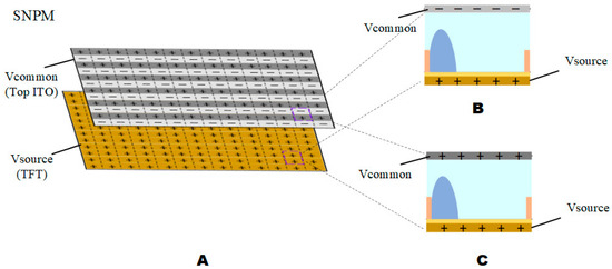 Schematic diagram of source polarization EWD model. (A) In TFT-EWD, Top ITO and TFT were connected to signal and signal respectively. (B) When was positive, was negative. (C) When was positive, was negative.