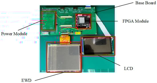 As shown in Figure 8, the electrowetting display system consisted of a power module, a field programmable gate array module, a substrate, an LCD, and EWDs. The power for each module was supplied by the power module. The EP4CE75F23C8 from Altera was used as a core control chip of the dynamic adaptive display testing system. The effective display resolution of EWDs was . To evaluate the effectiveness of the output signal, an LCD screen with a resolution of was used as a signal detector to receive the same signal as EWDs.