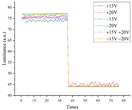 EWDs were tested under DC driving and switched pixels between “on” and “off” states every second interval. Six kinds of DC driving voltages were used to drive the EWD. As can be seen from Figure 10, the luminance of the driving voltage of −20 V was the largest, followed by the combined driving voltage waveform of −15 V and −20 V, and the performance of +15 V and +20 V was relatively stable. The lowest luminance was highest for +20 V. Under the DC driving voltage, the difference in the reflected luminance of each driving waveform was not apparent.