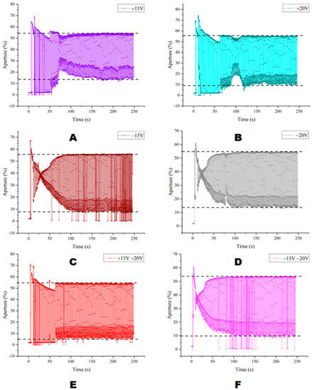 Aperture ratio in each DC driving state. (A) +15 V DC driving waveform. (B) +20 V DC driving waveform. (C) −15 V DC driving waveform. (D) −20 V DC driving waveform. (E) +15 V and +20 V mixed DC driving waveform. (F) −15 V and −20 V mixed DC driving waveform.