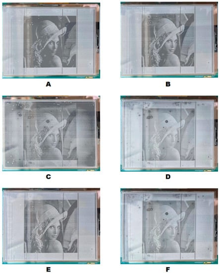 As shown in Figure 12A, compared with Figure 12B,E, the image details were missing, and the overall picture was darker. Due to the obvious oil backflow phenomenon under −15 V driving conditions, the Figure 12C image was blurred. Compared to Figure 12B,E and Figure 12D,F, images had lower contrast. The image display effect of Figure 12B,E under six kinds of driving waveforms was the best. The image quality of Figure 12B,E on the visual level was basically the same, therefore, it was feasible to sacrifice a certain aperture ratio to avoid the problem of oil backflow.