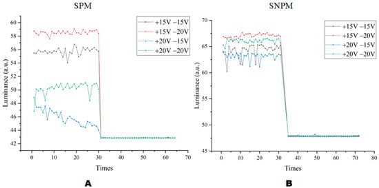 It can be seen in Figure 13 that the combined waveform of +15 V and −20 V had the highest reflected luminance and the combined waveform of +20 V and −15 V had the lowest reflected luminance. When in SNPM, the reflected luminance of EWDs was higher than that in SPM. At the same time, the average reflected luminance in Figure 13B was significantly greater than that in Figure 13A under the combination of +15 V and −20 V. The average reflected luminance in Figure 13B was significantly greater than the average reflected luminance in Figure 13A under the combined waveform of +20 V and −15 V. Therefore, the SNPM could bring better-reflected luminance. In addition, it could be observed from the comparison of Figure 10 and Figure 13 that better dynamic picture display quality can be achieved at the expense of a certain amount of reflective luminance.