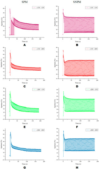 Aperture ratio under different AC driving models. (A) The aperture ratio of +15 V and −15 V AC driving in SPM. (B) The aperture ratio of +15 V and −15 V AC driving in SNPM. (C) The aperture ratio of +15 V and −20 V AC driving in SPM. (D) The aperture ratio of +15 V and −20 V AC driving in SNPM. (E) The aperture ratio of +20 V and −15 V AC driving in SPM. (F) The aperture ratio of +20 V and −15 V AC driving in SNPM. (G) The aperture ratio of +20 V and −20 V AC driving in SPM. (H) The aperture ratio of +20 V and −20 V AC driving in SNPM.