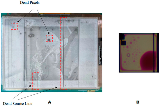 Some anomalies occurred during the experiment, as shown in Figure 16. As shown in Figure 16A, there were many dead pixels and dead source lines on the screen. The EWD preparation process and production quality were the main factors affecting the current display, resulting in the appearance of dead pixels and abnormal vertical stripes, which affect the overall appearance. Figure 16B was the phenomenon of oil splitting occurring during the aperture ratio test. Ideally, the oil shrinks in one corner of a pixel when driving a voltage is applied to EWD in the process of oil shrinkage. However, the oil may be split into two or more parts. The reason is that the charges in the hydrophobic insulator can cause a sudden change in the electric field. When the capacitance value of a pixel increases rapidly, it is likely to cause oil splitting [11].