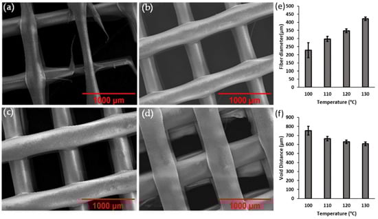 SEM images of 3D-printed PCL at (a) 100 °C, (b) 110 °C, (c) 120 °C and (d) 130 °C. Distribution of average size for (e) fiber diameter and (f) void distance at various temperatures.