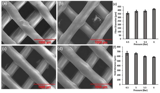 SEM images of 3D-printed PCL at (a) 4.5 bar, (b) 5.0 bar, (c) 5.5 bar and (d) 6.0 bar. Distribution of average measurement for (e) fiber diameter and (f) void distance at various pressures.