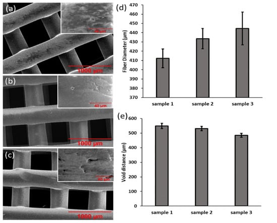 SEM images of 3D-printed (a) sample 1, (b) sample 2 and (c) sample 3 with insets of surface morphology. Distribution of average size of (d) fiber diameter and (e) void distance.