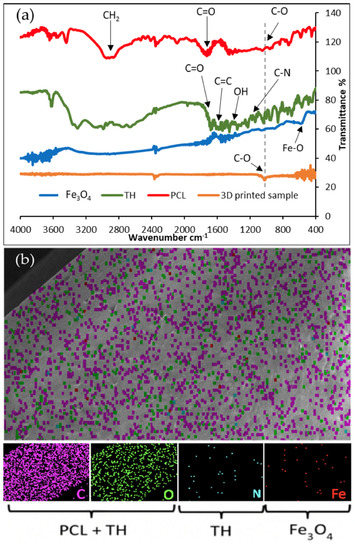 To determine the successful encapsulation of TH and IONPs in the 3D-printed structure, FTIR and EDX were conducted and are presented in Figure 4. Figure 4a displays the transmittance spectra for each raw component in powder form that forms the 3D-printed sample and attenuated total reflectance (ATR) of the 3D-printed sample. Due to the structure of the 3D-printed sample, it could not be ground with a pestle and mortar into powder form for FTIR. Therefore, ATR was conducted as a result to form transmittance spectra. The characteristic peaks of pure PCL are observed at 2951 and 2862 cm−1, which represent methylene (CH2) groups and carbonyl groups (C=O) observed at 1714 cm−1 []. The TH spectra has peaks at 1614 and 1666 cm−1, which correspond to the stretching of aromatic ring C=C and C=O, respectively. OH bending is represented by a peak at 1454 cm−1 and 1228 cm−1 peak equates to C-N stretching and N-H bending in the transmittance of TH []. The FTIR spectrum of Fe3O4 has a typical characteristic peak which is at 573 cm−1, this is due to the presence of Fe-O bond []. The result for the 3D-printed sample presents a mostly flat spectrum with the exception of a peak at 1030 cm−1, which is characteristic of PCL corresponding to a shifted characteristic peak of PCL, suggesting that relatively lower concentrations of TH and IONPs are encapsulated within PCL.