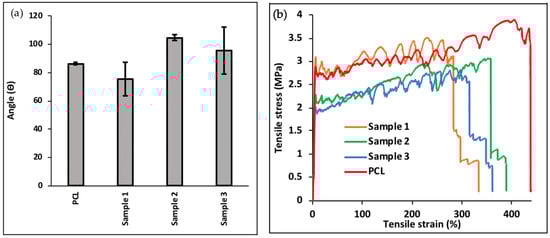 Analysis on 3D-printed samples. (a) Water contact angle results of 3D-printed samples and PCL, and (b) tensile test.