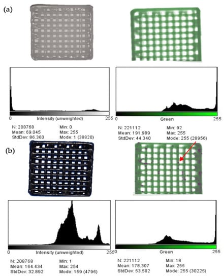 The fusion of IONPs with PCL results in a contrasting difference compared to pure PCL. Figure 6a,b display a photograph of 3D-printed PCL without Fe3O4 and with Fe3O4 nanoparticles in the top left of each figure. The drastic difference in color is attributed to Fe3O4 nanoparticles, which show black in its natural form. To statistically signify the contrasting difference, a color measurement was conducted, which concluded that the printed sample of PCL without Fe3O4 nanoparticles was measured to be 99% white, whereas PCL with Fe3O4 nanoparticles is 37.34% white as a result of the IONPs outcasting white PCL and forms a predominantly black sample. The histograms below the photographs of the two samples correspond to the intensity of the contrast; for PCL, without Fe3O4 nanoparticles, there is minimal intensity and a mean value of 69 pixels, whereas there is a significant increase in contrast intensity for printed PCL with Fe3O4 nanoparticles, with a mean of 164 pixels. This difference implies a statistically supported contrasting difference as a result of the encapsulation of IONPs within PCL structures.
