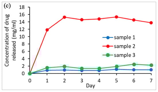 TH has been extensively used as an antibiotic in drug delivery systems due to its broad spectrum therapeutic capabilities [,]. Figure 6c shows TH release profile formed from printed structures using UV–VIS spectroscopy during a 7-day study. Each sample displays a sustained release profile, unlike typical burst release profiles, which are reported for drug delivery studies using TH []. Price et al. reported an approximate 90% release within 30 h of TH from a polymeric carrier. The encapsulation of TH within PCL via HME in this study allows for the drug release to be minimal and therefore enables the drug delivery system to operate for a longer period of time. Sample 2 exhibits the largest amount of drug release averaging at 14.32 mg/mL, whereas sample 1 and sample 3 exhibit average drug releases of 0.93 and 1.85 mg/mL, respectively. The high release from sample 2 is due to micropores on the sample surface and its geometry. Goyanes et al. reported a study on the effect of geometry on drug release from HME samples, suggesting that drug releases from the samples were dependent on the surface area to volume []. In comparison to reported research, the release profile of TH depends on the nature in which TH is contained within the DDS. Turan et al. reported a cumulative drug release of loaded TH copolymer/gelatin nanofibrous membranes. The results had shown that the trend between TH concentration and release percentage was a negative correlation: as the TH concentration increased, the release percentage decreased []. In contrast, Wang et al. reported a directly proportional relationship between increasing concentration and the release of TH from encapsulated fibers of PCL/PVP in the form of patches []. However, preparation of PCL containing Fe3O4 nanoparticles and TH drugs via HME coupled with FDM is promising for the development of 3D-printed matrices for CT imaging and drug delivery.