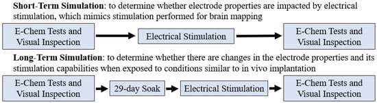 The long-term test was designed to determine whether there are changes in the electrode properties and its stimulation capabilities when exposed to phosphate buffered saline (PBS) for the duration of the longest authorized implantation period. The test consisted of electrical stimulation to establish baseline values followed by a 29-day passive soak, during which the devices were immersed in 1× PBS at body temperature (37 ± 3 °C). The test ended with electrical stimulation to simulate functional brain mapping. The results of pre- and post-testing were compared to evaluate changes in material performance.