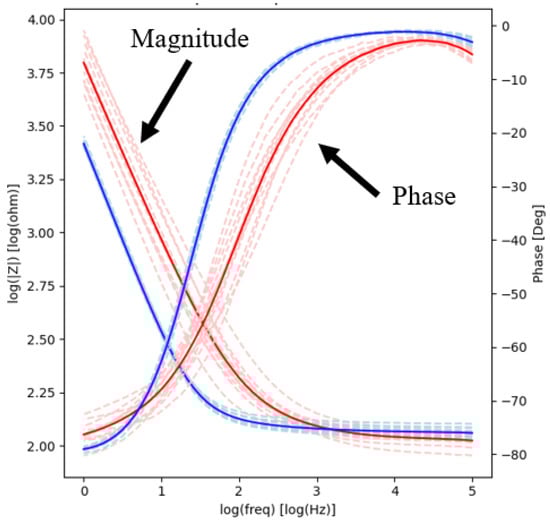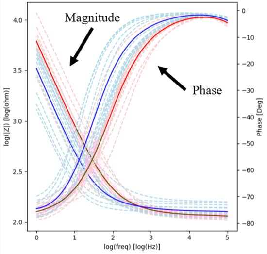 EIS plots before and after short-term electrochemical testing. Impedance magnitude (left Y scale) and impedance phase (right Y scale) are plotted as a function of frequency. The red and blue lines are impedance magnitude measurements made before and after the electrochemical testing, respectively. The dashed lines represent all data recorded, and the solid lines are the averages of the respective category.
