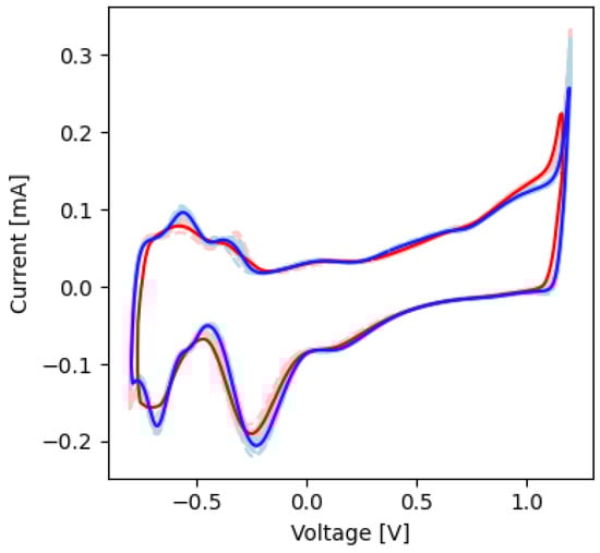 The devices were designed to record electrical signals with high fidelity as well as deliver electrical stimulation for brain mapping. Pt was chosen as the contact material for this interface due to its high electrical conductivity, inert nature, and corrosion resistance [,,]. To demonstrate that Pt is the only electrochemically active material on the device, CV was used to evaluate the behavior of the device as a function of electrical potential. This experiment also characterized the electrochemically active material within the device to evaluate whether nonreversible chemical reactions occur within clinically relevant potentials []. CV was performed in the same three-electrode cell setup described previously. The voltammograms of the electrodes were scanned between potential limits of −0.8 V to 1.2 V at a scan rate of 50 mV/s []; these limits were established through a wide voltaic sweep from −2 V to 2 V on a separate device to determine the voltages at which large-scale runaway reactions would begin to occur, also known as the water window. Data analysis was performed to determine the Faradaic peaks on the plot and their accompanying reactionary sequence. The average charge storage capacity, defined as the maximum charge available for a single electrical pulse, was calculated by integrating the entire voltammogram and dividing it by the scan rate and working surface area.
