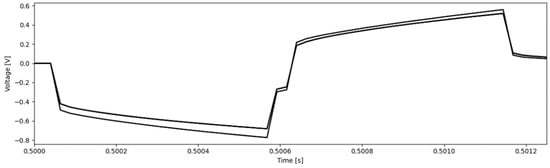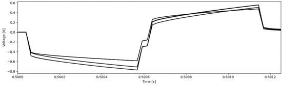 VT measurements demonstrated the polarization of the device during typical stimulation parameters and were used to determine whether over-polarization occurred. VT was performed in a three-electrode cell configuration with an Ag/AgCl (Antylia Scientific, Vernon Hills, IL, USA) reference electrode, and the electrode pair to be analyzed as the counter and working electrodes, all immersed in 1× PBS at room temperature. Constant-current, cathodic-first, charge-balanced stimulation was performed at 4 mA and a 10 µs interphase delay. VTs with a pulse width of 200 µs were run before and after testing to ensure that baseline electrical pulses were able to be applied without over-polarizing the electrodes. VTs with a pulse width of 535 µs were run after simulation to determine if the application of electrical pulses at the clinically relevant charge density of 30 µC/cm2 would over-polarize the electrodes. Three sets of pulses were run during each trial []. Data analysis was performed to determine the maximum change in voltage during polarization. This value was taken from the potential at the end of the current pulse, which represented the highest amount of polarization that the electrode would be subjected to during testing.