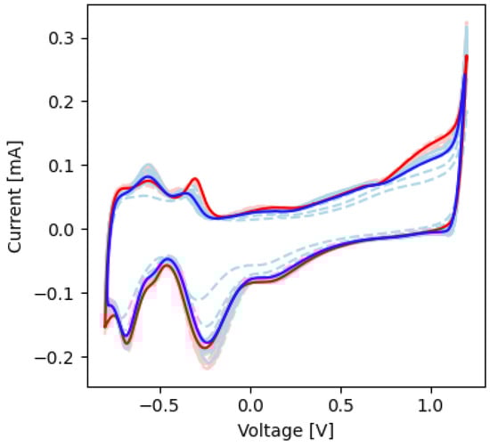 CV plots before and after short-term electrochemical testing. The dashed red and blue lines represent measurements made before and after electrical stimulation, respectively. The solid red and blue lines are the averages of the values before and after electrical stimulation, respectively.