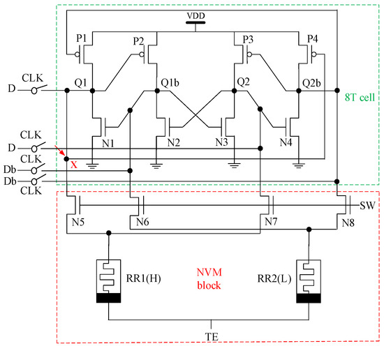 - Lee, A.; Chang, M.; Lin, C. RRAM-based 7T1R Nonvolatile SRAM with 2x Reduction in Store Energy and 94x Reduction in Restore Energy for Frequent-off Instant-on Applications. In Proceedings of the IEEE Symposium on VLSI Technology, Kyoto, Japan, 3 September 2015; pp. C76–C77. [Google Scholar]