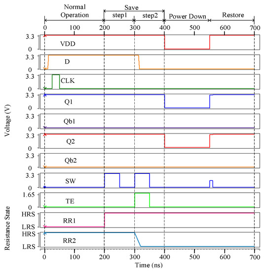 The purpose of this operation is to back up the values of the 8T cell into ReRAMs. This operation is controlled by the control signals SW and TE. The 8T cell has two different values (i.e., 0 and 1), and the two independent ReRAMs inside the NVM block require two different polarity biases. There are two steps in the save operation. We discuss the case where the voltage of D is 3.3 V (Q1 = Q2 = 1) and the voltage of Db is 0 V (Q1b = Q2b = 0). Step 1: The values of Q1 and Q2 need to be stored in RR1. At this time, V, V. The potential difference between Q1 and TE can reset RR1 to HRS. Step 2: The values of Q1b and Q2b need to be backed up into RR2. The voltage of SW still remains high whereas TE goes high (see Figure 2). The potential difference between Q1b and TE can set RR2 to LRS. Note that, the high voltage of TE is different from that of the other terminals and it is adjusted to 1.65 V (according to the Equations (2) and (3)) instead of 3.3 V to enhance the error margin of the proposed radiation-hardened NV-latch; Q1, Q1b, Q2, and Q2b, in fact, are unable to achieve the desired high (3.3 V) or low (0 V) voltages. Meanwhile, the access transistors, such as N5, N6, N7, and N8, have conduction resistance. Hence, the voltage values on the bottom electrodes of the ReRAMs are not equal to those of Q1 or Q1b. Note that the voltage of TE should always satisfy Equations (2) and (3). Therefore, the voltage of TE is set to 1.65 V in Step 2.