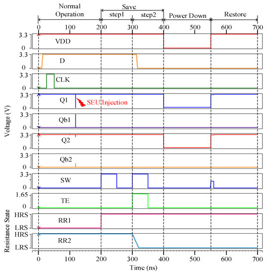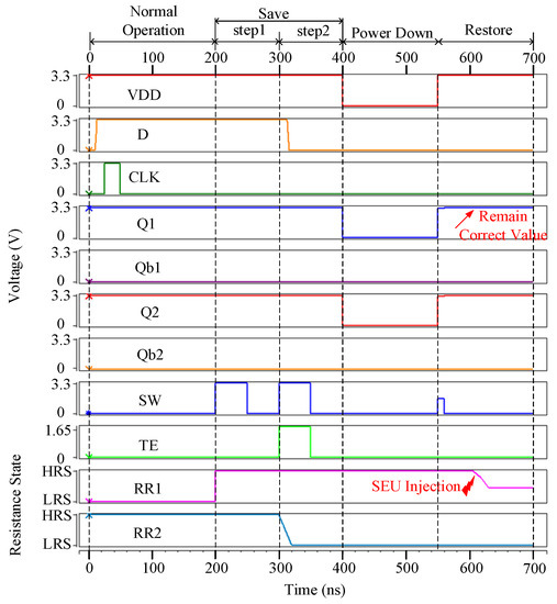Figure 3 shows the error-free simulation result for the proposed NV-latch, which proves the value recovery capability of the latch. The original values stored in Q1, Q1b, Q2, and Q2b were set to ‘1’, ‘0’, ‘1’, ‘0’, respectively. It can be seen from Figure 3 that, during the normal operation, the working principles of the proposed NV-latch are similar to those of a standard latch. In the save operation, according to the values of Q1, Q1b, Q2, and Q2b, the resistance states of ReRAMs were set to HRS and LRS, respectively. During the power down operation, the voltage of VDD became 0 V. During the restore operation, the values were restored according to the resistance states of ReRAMs. Therefore, the error-free operations of the proposed NV-latch are correct.