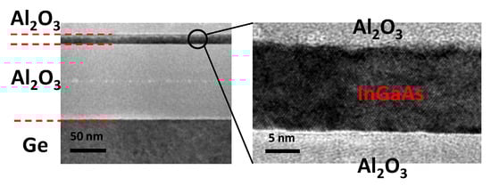 To prepare the InGaAs-Insulator-Ge substrate, (100) n-Ge wafer (resistivity: 10~20 ohm.cm) and p-In0.53Ga0.47As/InP wafer (doping: ~1016 cm−3) was manually bonded together in the air, with the 50 nm-thick Al2O3 film deposited by atomic layer deposition (ALD) on both wafers []. After annealing process in N2 ambient at 300 °C for 30 min, InP was selectively etched by HCl solution to fabricate the InGaAs 100 nm-thick Al2O3-Ge substrate. The cross-sectional TEM observation of the final structure in Figure 1 shows that an 8 nm-thick InGaAs layer has been successfully transferred to the top of 100 nm-thick Al2O3 on the Ge substrate with sharp interface and excellent uniformity.