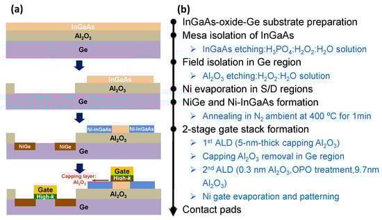 Correspondingly, in the continuous evolution of the CMOS technology, heterogeneous integration between InGaAs nMOSFETs and Ge pMOSFETs is attracting growing research interest, with the expectation to deliver advantageous nMOSFETs and pMOSFETs performance simultaneously [,,,]. However, the integrated fabrication of these two MOSFETs has long been challenging, considering the different fabrication and processing methodology of the gate oxide. For the oxide/semiconductor interface engineering, fabrication procedure of Ge-based pMOSFETs usually utilizes post-oxidation treatment to suppress the interface traps in Ge gate oxide [], while for InGaAs-based nMOSFETs, the self-cleaning effect before oxide deposition in atomic layer deposition (ALD) is preferred [,]. Meanwhile, the thermal budget during the fabrication of the S/D terminal with the dopant activation in the well could also introduce severe degradation of the gate stack quality []. Although a metal source/drain (S/D) has been proposed in ultra-shallow junctions formation with low contact resistances based on low temperature [], the possible influences on the integrated two gate stacks of Ge- and InGaAs-based MOSFETs are still to be evaluated.