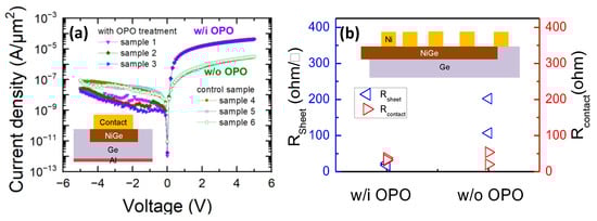As illustrated in Figure 2, the OPO treatment has been employed as a novel strategy for the interface engineering of Al2O3/Ge for low interface state density and small EOT []. Considering this, the OPO treatment after the NiGe/Ge junctions could impact on the previously fabricated metal S/D, NiGe/Ge junctions with additional OPO treatment subsequent to metallization as well as control sample with no OPO treatment were fabricated. The fabrication of the NiGe/Ge junctions began with the series cleaning of the n-Ge wafers by acetone, de-ionized water and BHF solution. A total of 20 nm Ni was then evaporated by electron beam evaporation and annealed in N2 ambient at 400 °C for 1 min to produce the shallow alloyed junction. Then, the OPO treatment at 300 °C for 1 min in ALD was performed on some of the samples, while the others experienced no OPO treatment. Ultimately, Ni was evaporated as the contact pad, while Al was deposited as the back contact. Figure 3a shows the current density of NiGe/Ge junctions with and without OPO treatment. The on-current of NiGe/Ge junctions with OPO treatment is one order larger than those control samples. Figure 3b gives the correspondingly calculated sheet resistance and contact resistance of NiGe/Ge structure. It could be observed the sheet resistance can be reduced by 80% for NiGe film with OPO treatment, while the contact resistance in both cases has similar values. That is, the OPO treatment in the gate stack process is generally beneficial for the metal S/D in the Ge pMOSFETs with lowered sheet resistance.
