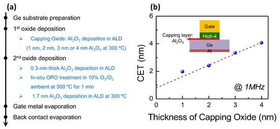 Experiment of Ge MOSCAPs with different capping oxide thickness from 1 nm to 4 nm. (a) Fabrication process, (b) capacitance equivalent thicknesses of different MOSCAPs.