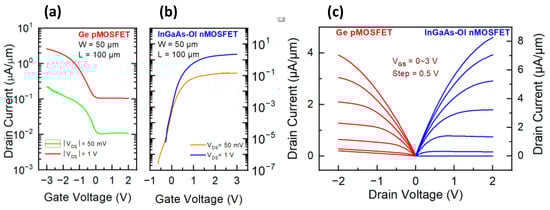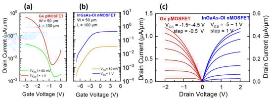 The corresponding transfer and output characteristics of the gate-last InGaAs-OI nMOSFETs and Ge pMOSFETs (width/length = 50 μm/50 μm) were characterized to directly examine the potentials of the integration of the two MOSFETs in Figure 5. Generally, the two devices show symmetric output performance with current level reaching ~1 μA/μm. However, the leakage current in both p- and n-MOSFET in level of 10−3 μA/μm is relatively higher. Considering that, the gate stack has been well protected from the thermal budget during the fabrication of the metal S/D in the gate last process, the device leakage characteristics could be a result of the exposure of the oxide/semiconductor interface to the prior S/D fabrication process, which could introduce detrimental contaminations.