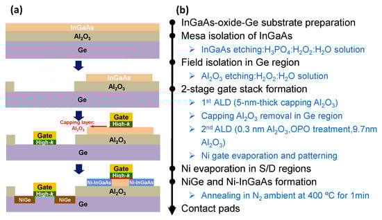 (a) Cross section views of devices and (b) Key fabrication process of gate-first fabrication scheme of InGaAs-OI nMOSFET and Ge pMOSFET with dual-gate oxide technique.