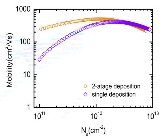 Electron mobility comparison of InGaAs-OI nMOSFET with two-stage gate oxide and one-stage gate oxide (width/length = 50 μm/100 μm).