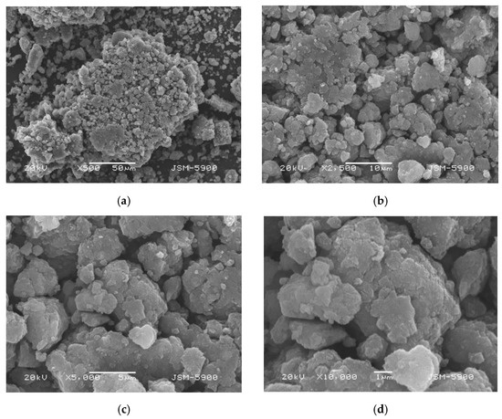 Figure 1 shows micrographs obtained by SEM (scanning electron microscopy) (JSM-5900, JEOL Ltd., Tokyo, Japan) at different magnifications of Mg-5Ni dehydrogenated at the eighth cycle [15]. Shapes of particles are irregular, and particle size is not homogeneous. Particles are agglomerated. Quite small particles are on the surfaces of agglomerates.