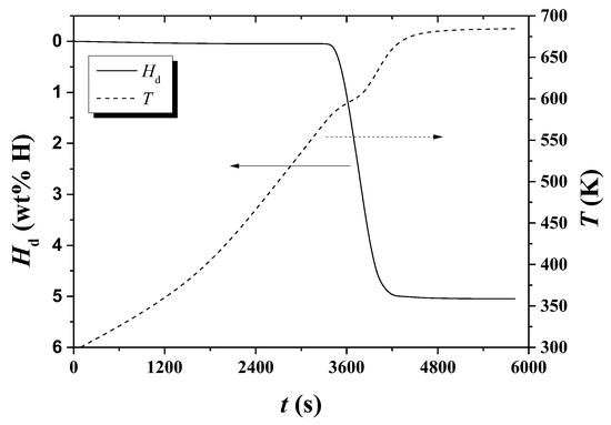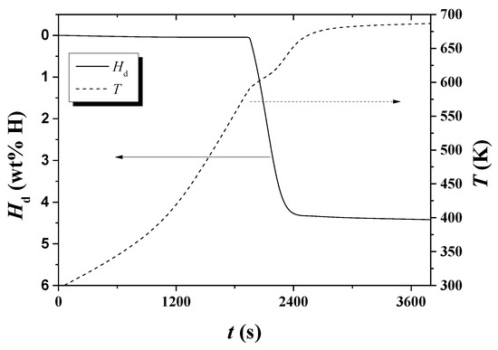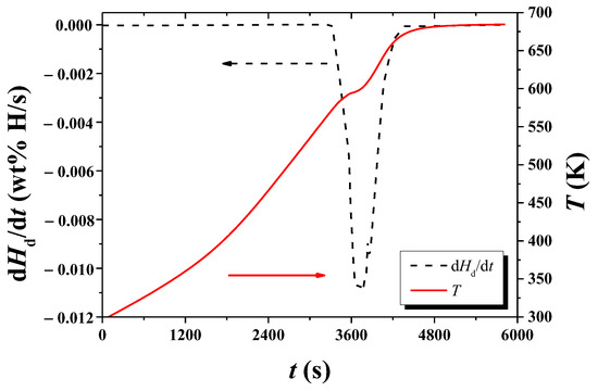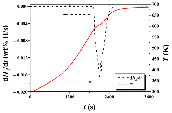 The variations of Hd and temperature T with t under 1.0 bar H2 for hydrogenated Mg-5Ni are shown in Figure 3. The sample was heated with a heating rate of 12 K/min. The sample begins to release hydrogen after about 1930 s, releases quite rapidly from about 2060 s to 2190 s, and releases hydrogen very slowly after about 2490 s. With time, the temperature increases slowly and then more rapidly. Subsequently, the temperature passes a point of inflection, increases more rapidly again, and increases less rapidly in the end.