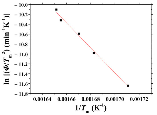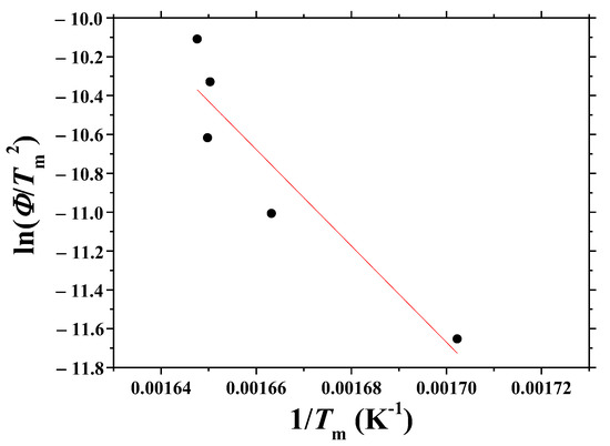 Plot of ln (Φ/Tm2) versus 1/Tm, obtained from the data of dHd/dt versus t curves and T versus t curves.